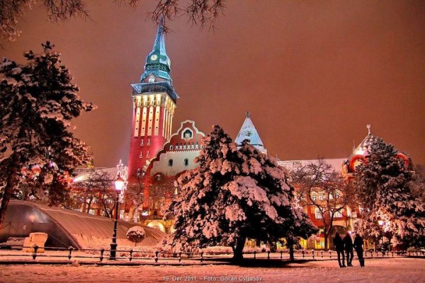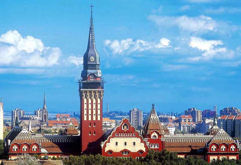 The City Hall of Subotica is its largest and, according to many, its most beautiful building. It was built within two years, from 1908 till 1910. However, it took two more years to decorate its interiors. The building was designed by Marcell Komor (1868-1944) and Dezső Jakab (1864-1932), two architects from Budapest in the fashionable and modern style of the times: Hungarian art nouveau. Most of the decorations are dominated by stylized flower patterns. The City Hall is a harmonious blend of arts and crafts. With an overall height of 76m and the observation deck terrace at 45,5m with 105,08m in length and 55,56m of width, it covers a surface of 5838m².